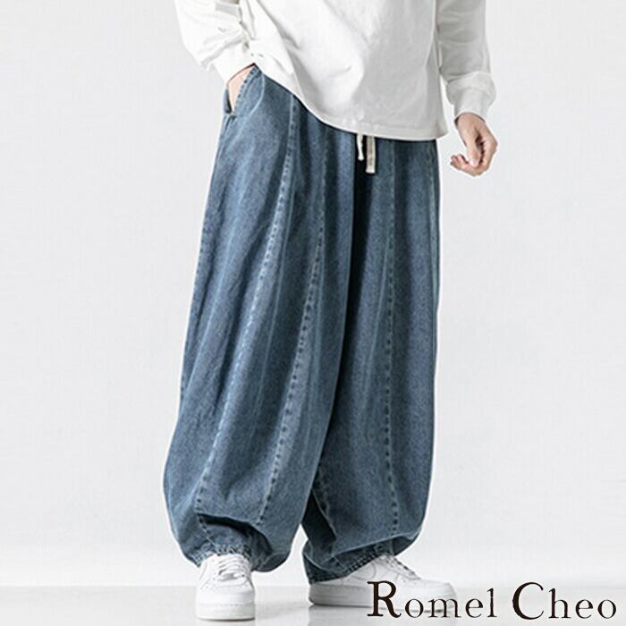【お支払い確認後20日以内発送】RomelCheo デニムワイドパンツ メンズ タイパンツ デニム サルエルパンツ ビッグシルエット バルーンシルエットパンツ デザインパンツ ダボパン ハーレムパンツ オーバーサイズ メンズ モード系 ストリート きれいめ 原宿系 サロン系 ファッション ロメルチェオ