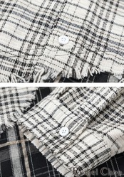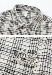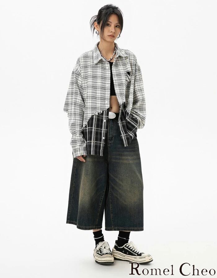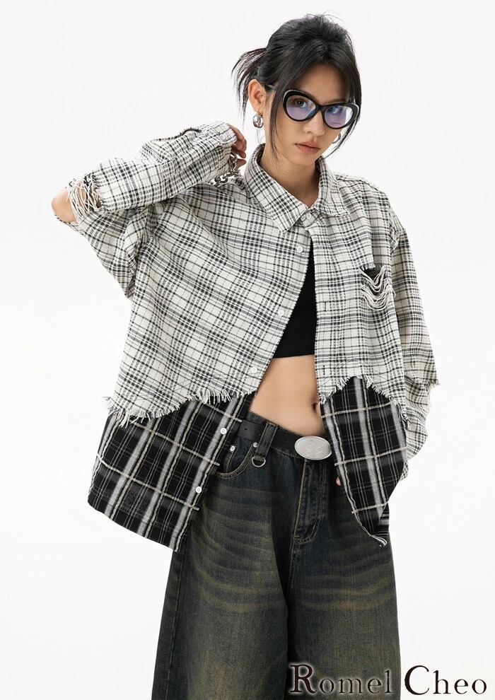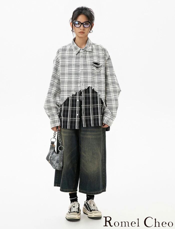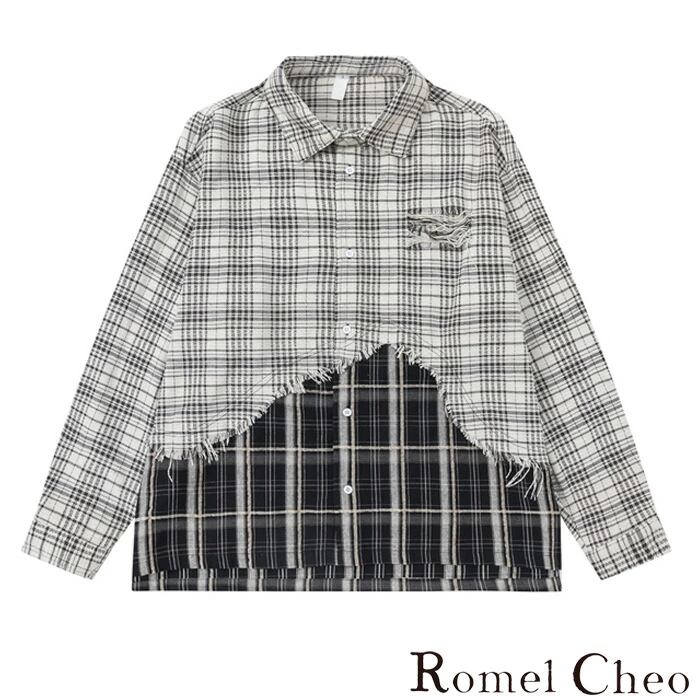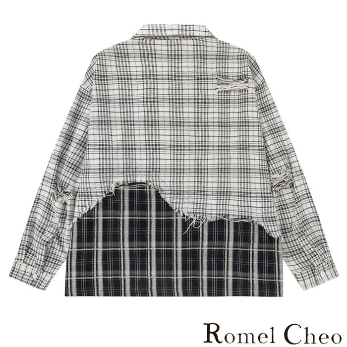 【お支払い確認後20日以内発送】RomelCheo リメイク風チェックシャツ チェック柄シャツ 切り替えシャツ デザインシャツ オーバーサイズシャツ ルーズシャツ ドロップショルダー ダメージシャツ ゆったり モノトーン レディース モード ストリート 原宿系 サロン系 ファッション ロメルチェ