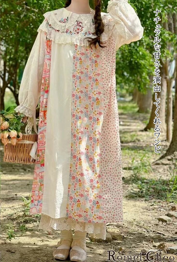 【お支払い確認後20日以内発送】RomelCheo フラワーパッチワークワンピース 花柄ワンピース ゆるかわワンピ フリルワンピ デザインワンピ 切り替えワンピ マキシ丈 ロング丈 ゆったり 長袖 ロマンティック ロリータ レディース モード ストリート 原宿系 サロン系 ファッション ロメルチェ