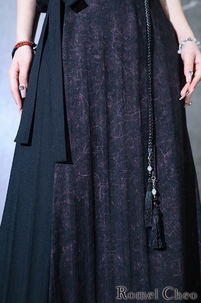 【お支払い確認後20日以内発送】RomelCheo 呪術柄 切り替えスカート 和風 レディース 病み 和柄 夏秋 コットン ポリエステル プリーツスカート Aライン ロングスカート マキシ丈 アシンメトリースカート 和モダン レディース モード系 ストリート きれいめ 原宿系 サロン系 ファッション ロメルチェオ