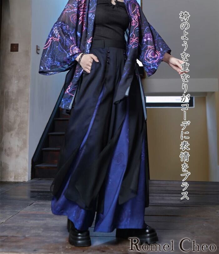 【お支払い確認後20日以内発送】RomelCheo 呪術柄 レイヤード袴パンツ ブルー レディース ワイドパンツ チャイナパンツ ワイドレッグパンツ レイヤードワイドパンツ デザインパンツ 総柄パンツ 和モダン レディース モード系 ストリート きれいめ 原宿系 サロン系 ファッション ロメルチェオ