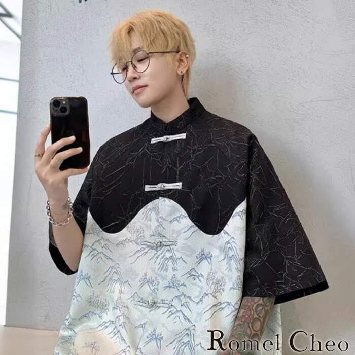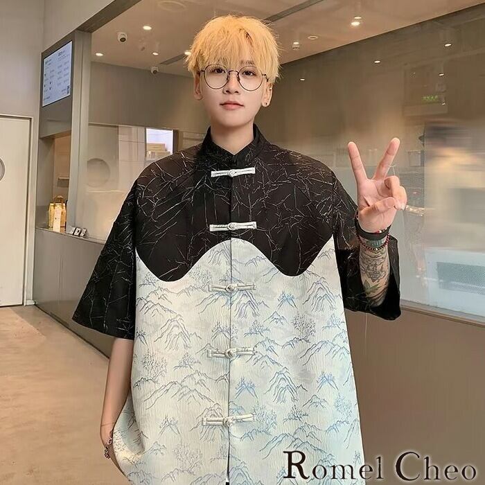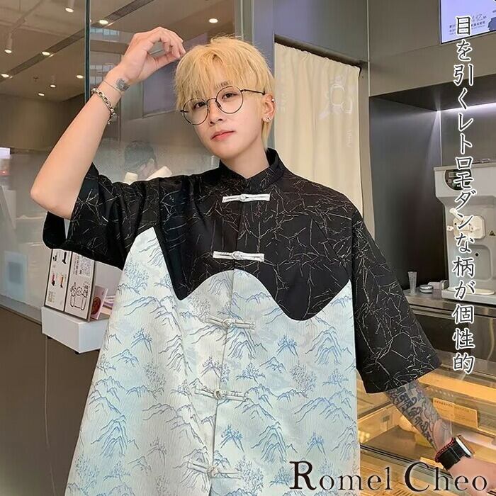 【お支払い確認後20日以内発送】RomelCheo バイカラー切替柄チャイナシャツ スタンドカラーシャツ バイカラーシャツ チャイナボタンシャツ カジュアルシャツ オーバーサイズシャツ ゆったり アジアンテイスト エスニック メンズ モード系 ストリート きれいめ 原宿系 サロン系 ファッション ロメルチェオ
