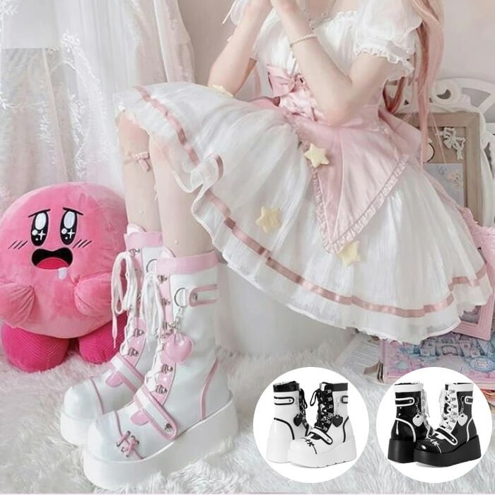 【お支払い確認後20日以内発送】RomelCheo スポーティーハート厚底ブーツ 編み上げブーツ レースアップブーツ デコレーションブーツ チャンキーヒール ミドル竹 ロリータ パンク ロック ガーリー おしゃれ レディース モード系 ストリート 原宿系 青文字系 ファッション ロメルチェオ