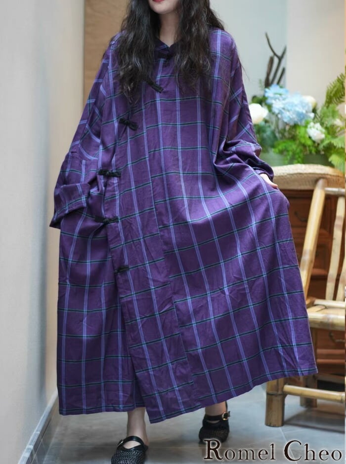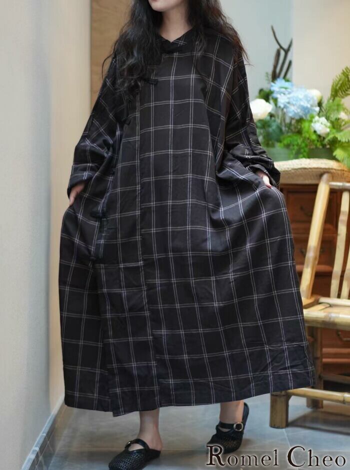 【お支払い確認後20日以内発送】RomelCheo チェック柄 チャイナボタンロングワンピース チェックワンピ チャイナボワンピ ロングワンピ カジュアルワンピ オーバーサイズワンピ ゆったり アジアンテイスト エスニック レディース モード系 ストリート きれいめ 原宿系 サロン系 ファッション ロメルチェオ