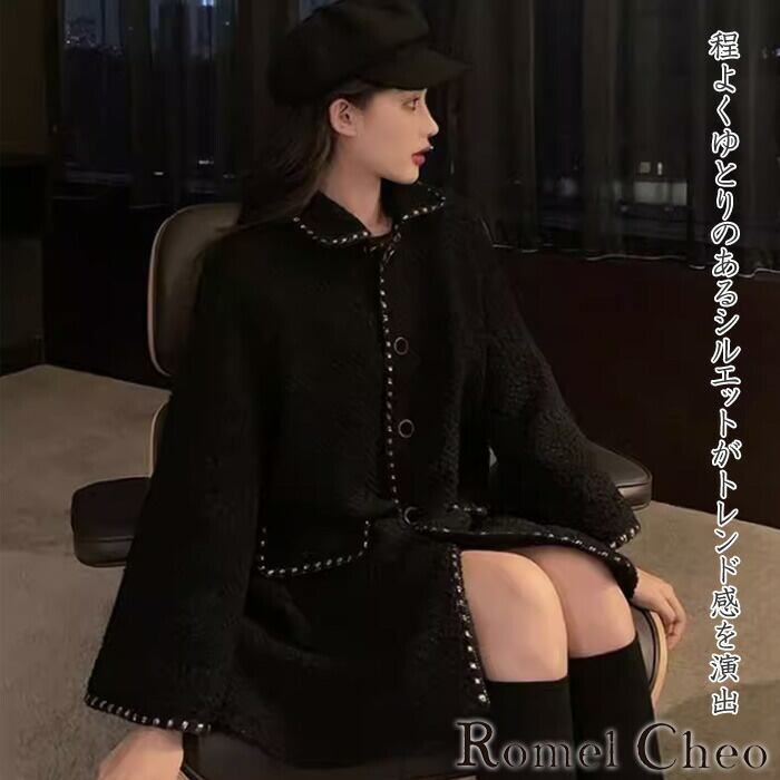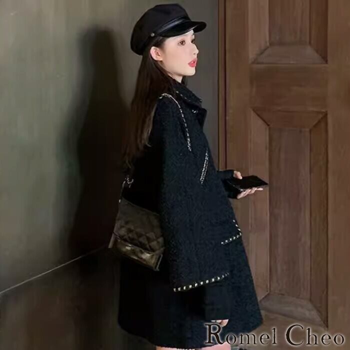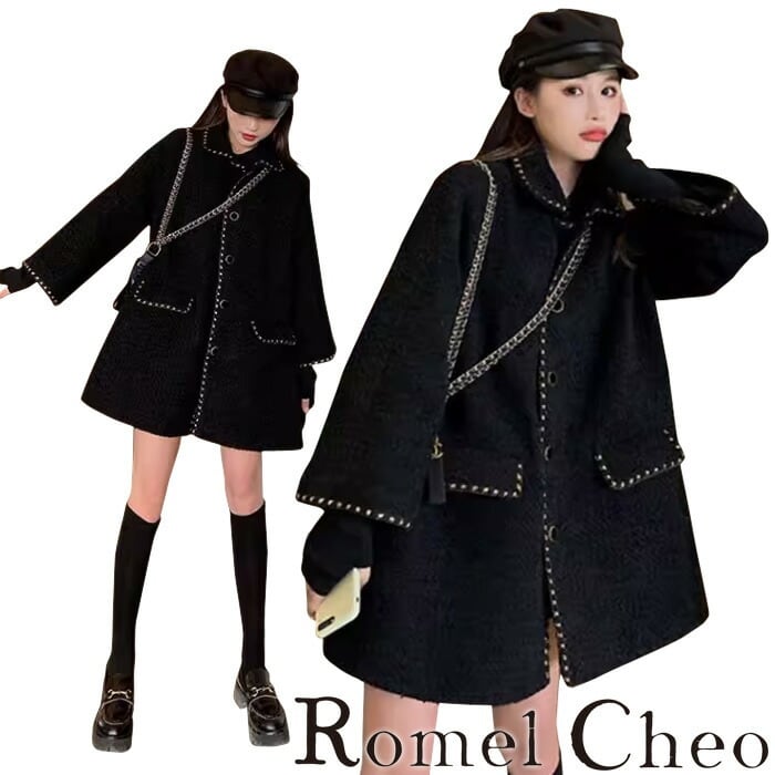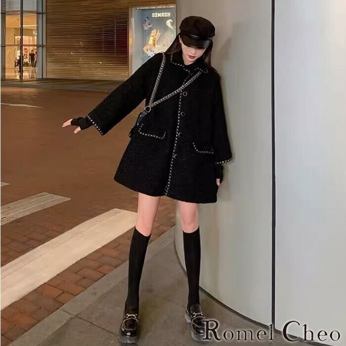 【お支払い確認後20日以内発送】RomelCheo ブラック ウールコート レディース ミドル丈コート 黒色 Aライン オーバーサイズコート デザインコート 膝上丈 ゆったり 長袖 ボリューム袖 ボリュームシルエット モノトーン モード系 ストリート 原宿系 青文字系 ファッション 個性的 ロメルチェオ