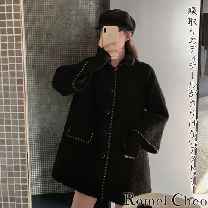 縁取りのディテールがアクセントになったミドル丈コートになります。