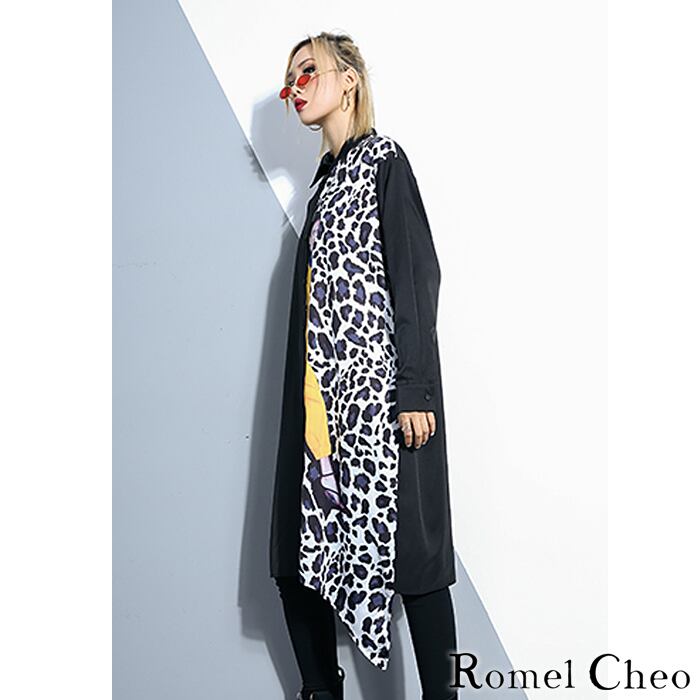 【お支払い確認後20日以内発送】RomelCheo ヒョウ柄 シャツワンピース ロングシャツ ワンピース アシンメトリー アシメ レオパード aライン 黒 レディース ひざ丈 長袖 カジュアル 原宿系 ファッション ストリート アニマル プリント 変形裾 春 秋 服 ロメルチェオ