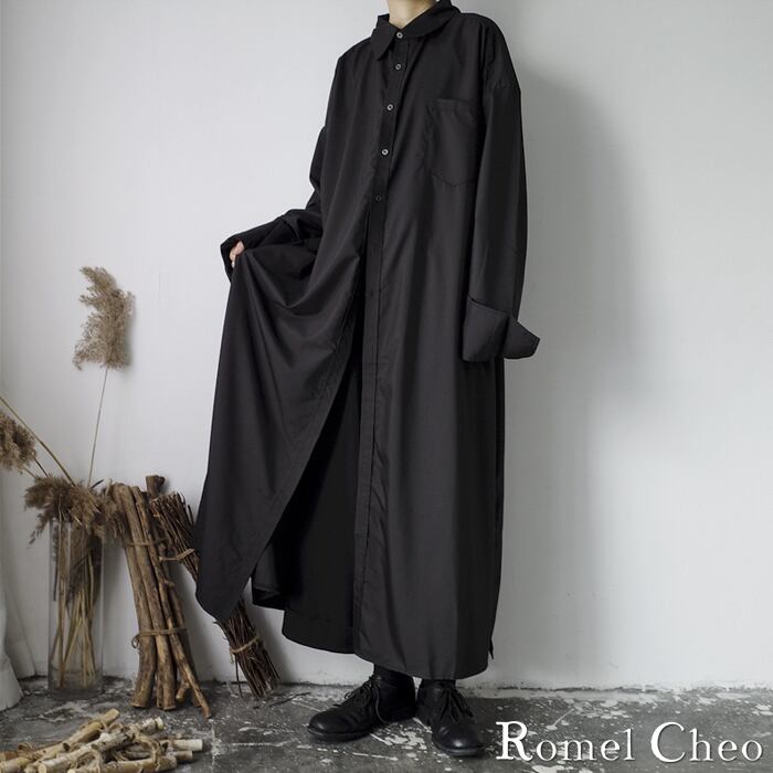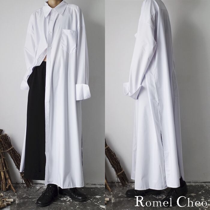 RomelCheo マキシ丈 ロング シャツ トールサイズ 白シャツ 黒シャツ モノトーン メンズ レディース ユニセックス ストリート モード系 v系 ロック 無地 長袖 きれいめ シンプル ゆったり ビッグシルエット サイド バック スリット ロメルチェオ
