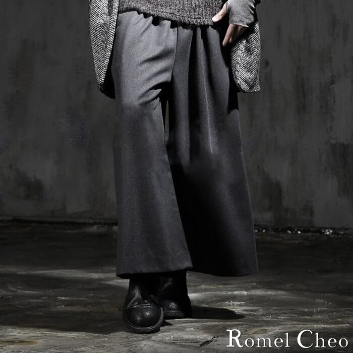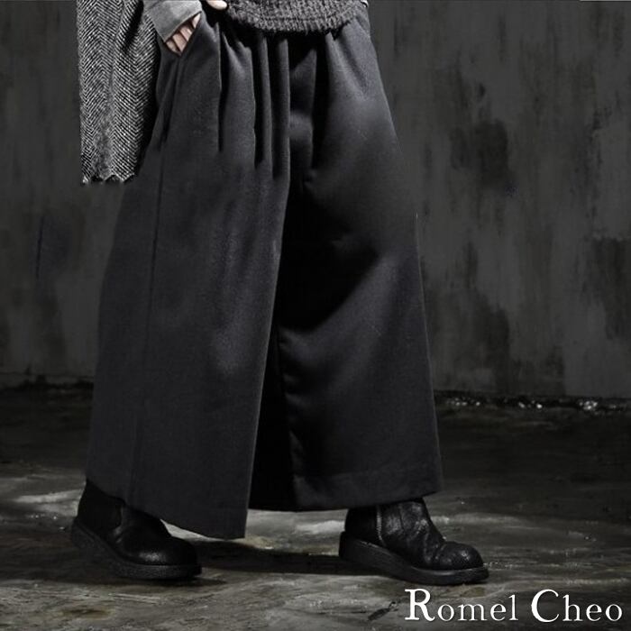 RomelCheo マキシ丈 袴 パンツ 和 ストリート ワイド メンズ レディース ユニセックス 黒 灰 イージーパンツ モード系 原宿系 ファッション クロップドパンツ ゆったり ガウチョ 無地 ビッグシルエット フレア モノクロ ロメルチェオ