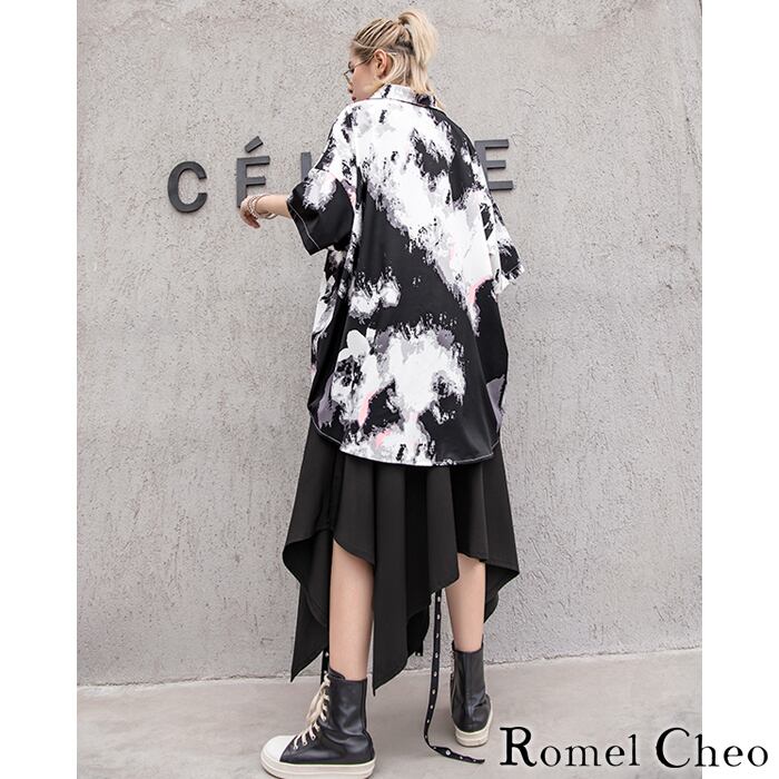 RomelCheo 水墨画 ロング丈 シャツ ビッグシルエット インク 墨絵 モノクロ ビッグT モノトーン 7分袖 ロンT 和柄 ドロップショルダー 原宿系 モード系 ストリート ファッション 半袖 白 黒 レトロ カジュアル 和風 アジアン エスニック ロメルチェオ