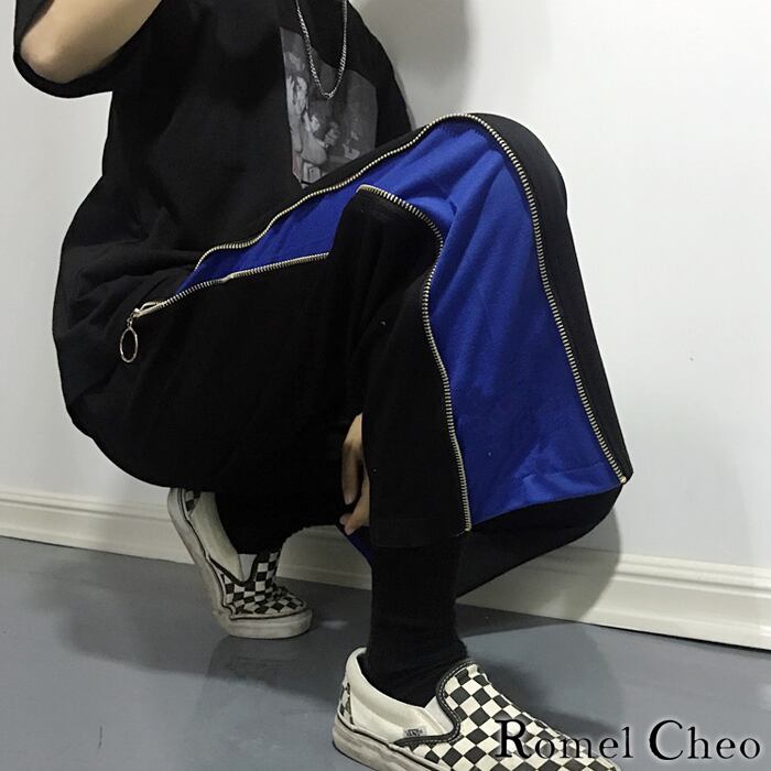 RomelCheo サイドチェーン パンツ 9分丈 2way ジップアップ ベルボトム 切替 バイカラー ツートン メンズ レディース ユニセックス オシャレ スリトート ファッション カジュアル 韓国 春 秋 服 クロップド ラッパズボン ロメルチェオ