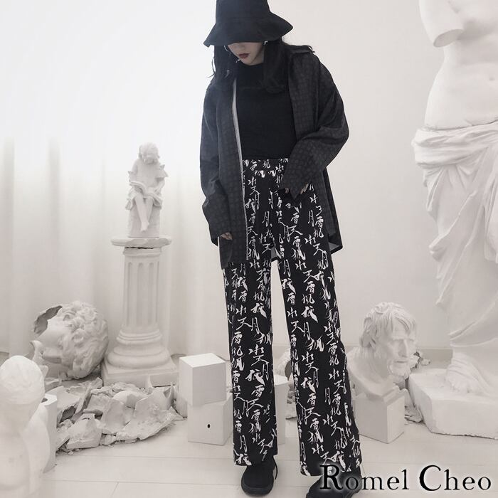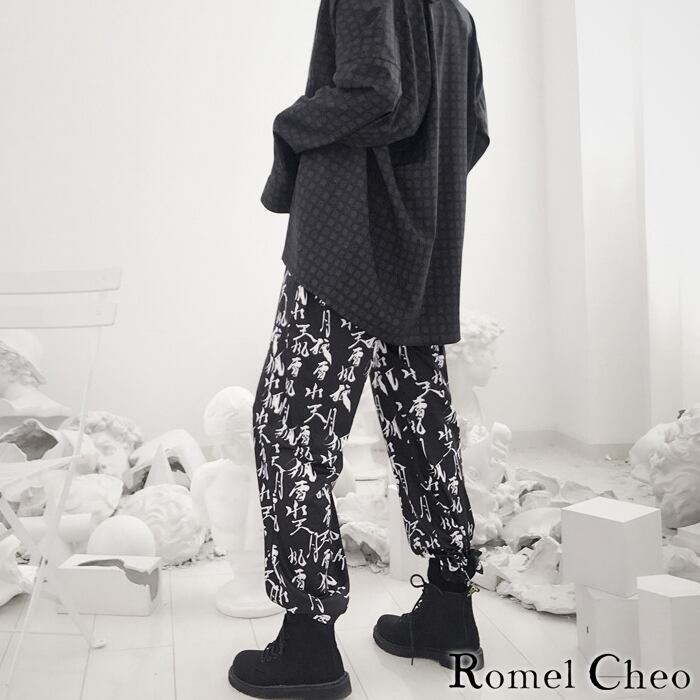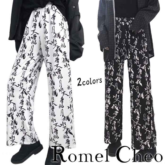 RomelCheo 漢字 ワイド パンツ イージー お経 プリント ストレッチ 韓国 ファッション カジュアル 原宿系 メンズ レディース ユニセックス 白 黒 中華風 書道 筆文字 個性的 エスニック 民族風 レトロ ロメルチェオ