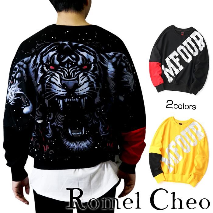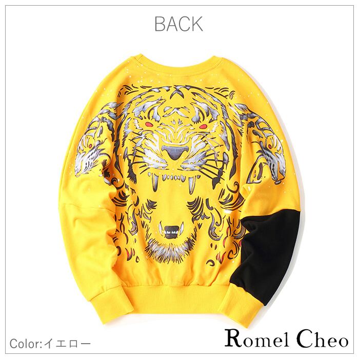 RomelCheo 虎柄 トレーナー アシンメトリー スウェット ドルマンスリーブ アニマル柄 スウェット インパクト メンズ レディース ユニセックス ストリート系 ファッション 切替 ロメルチェオ