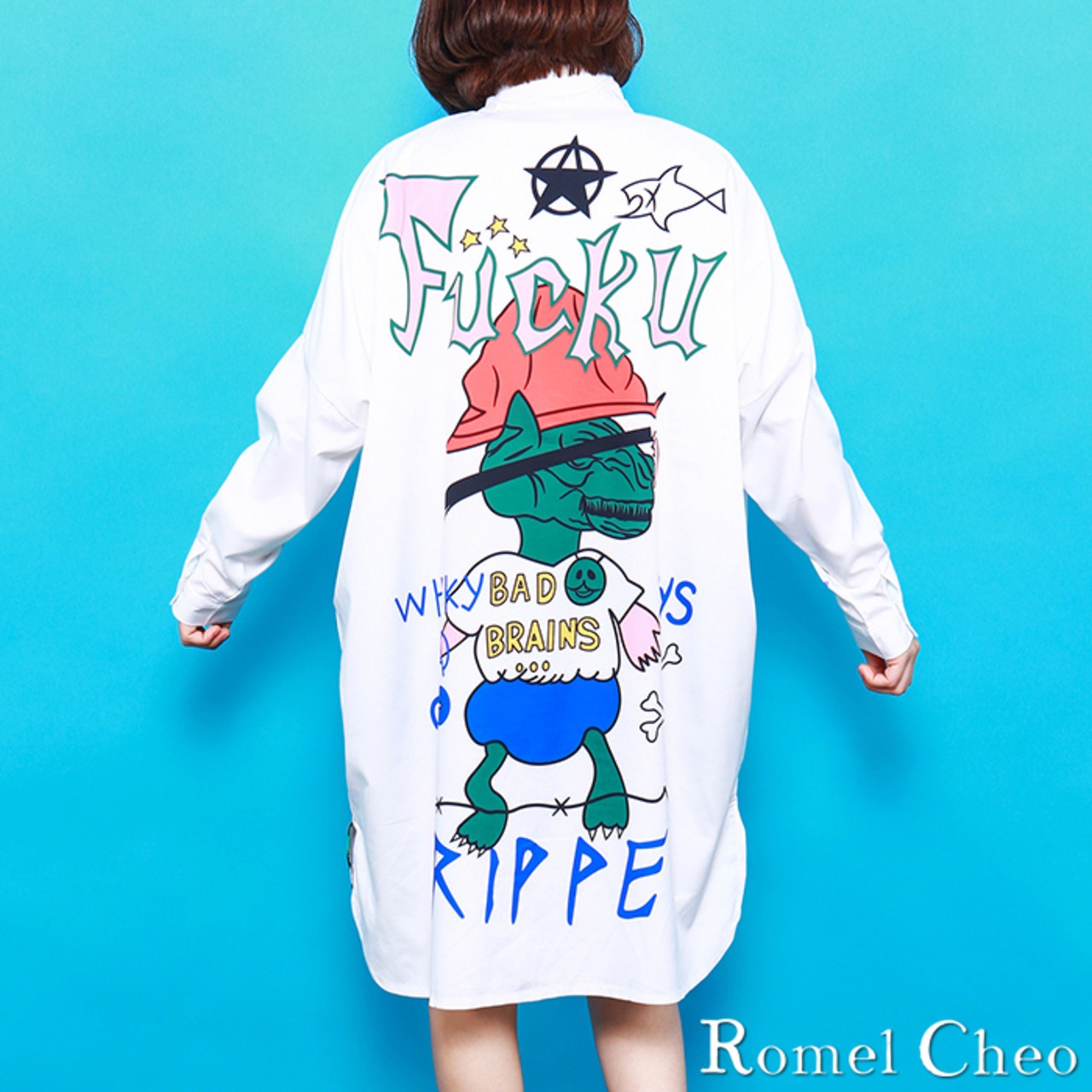 RomelCheo シャツ ワンピース ロング丈 落書き ロゴ プリント レディース ビッグシルエット 長袖 ひざ丈 白 黒 ストリート 原宿系 ファッション 個性的 イラスト アート 骨 春 秋 服 カジュアル ロメルチェオ