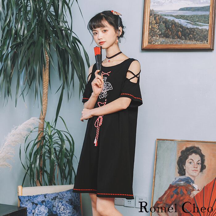 RomelCheo オフショルダー ワンピース ミニ 黒 セクシー 膝上 チャイナ風 和風 和柄 アジアン エスニック ファッション 普段着 原宿系 病みかわ ゆめかわ ガーリー 大人可愛い ストレッチ 肩あき レースアップ リボン ロメルチェオ