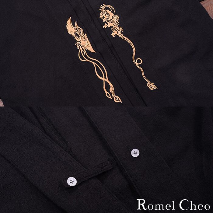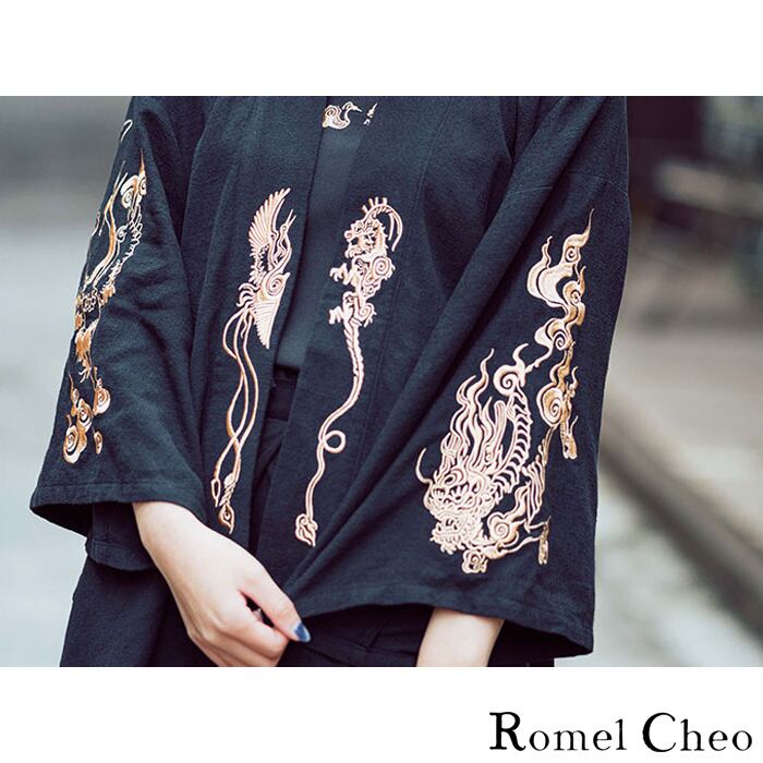 【送料無料】RomelCheo 龍柄刺繍 羽織り 和服 和装 カーディガン チャイナ風 鳳凰 和風 袴 和柄 アジアン エスニック ファッション モダン 黒 原宿系 モード系 コーディガン 9分袖 ベルト付き アウター 2way ロメルチェオ