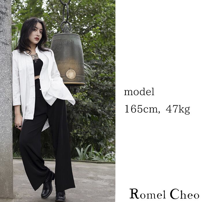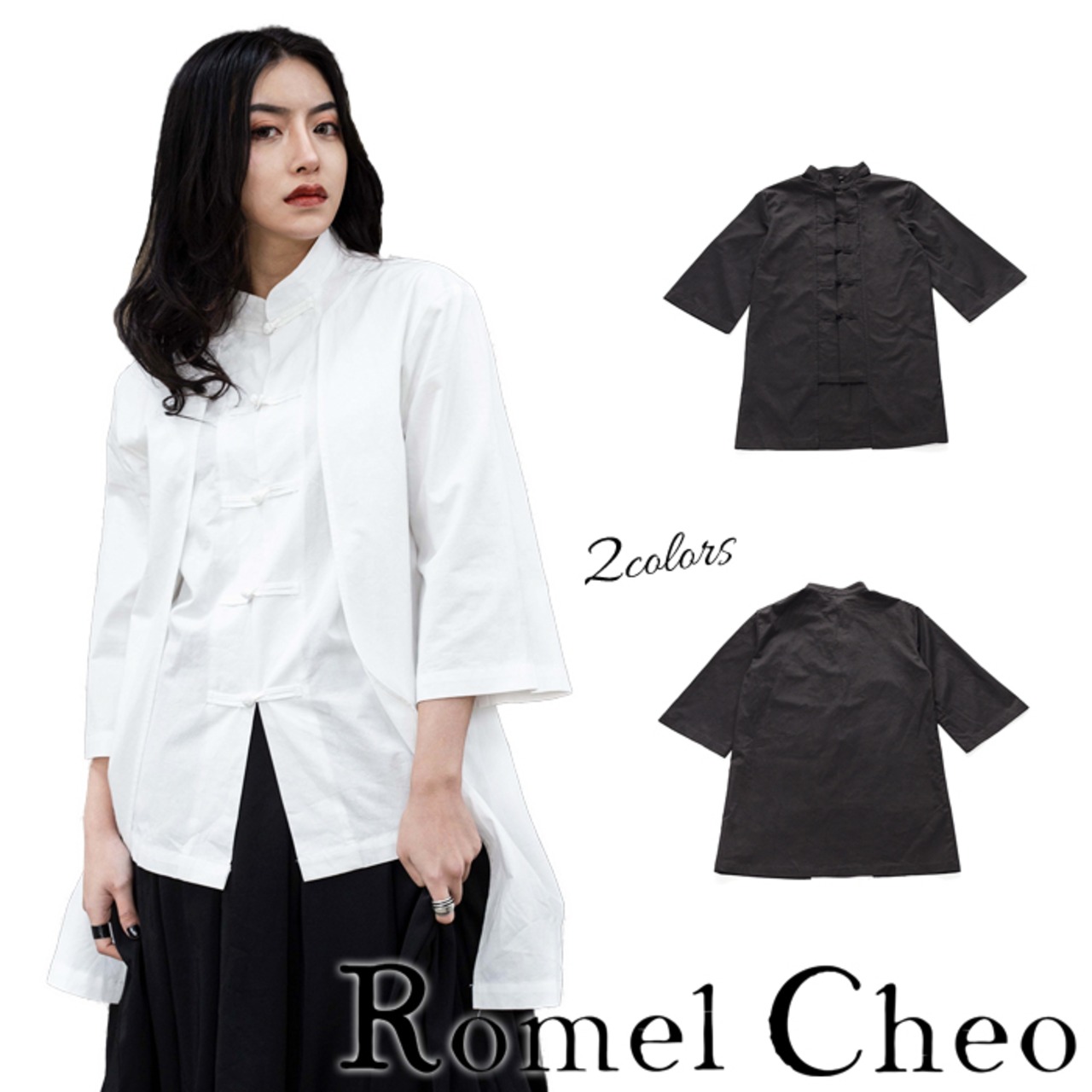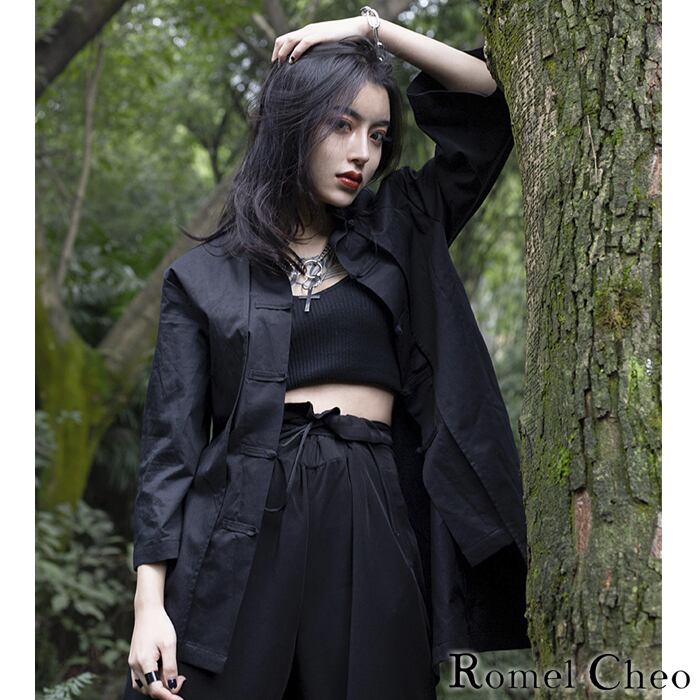 RomelCheo モノクロ チャイナシャツ チャイナ服 チャイナ風 羽織り チャイナボタン カンフー 太極拳 シャツ カーディガン 二重構造 羽織り 7分袖 病みかわ ゆめかわ マオ カラー 黒 白 モード系 モノトーン 原宿系 アジアン エスニック ロメルチェオ