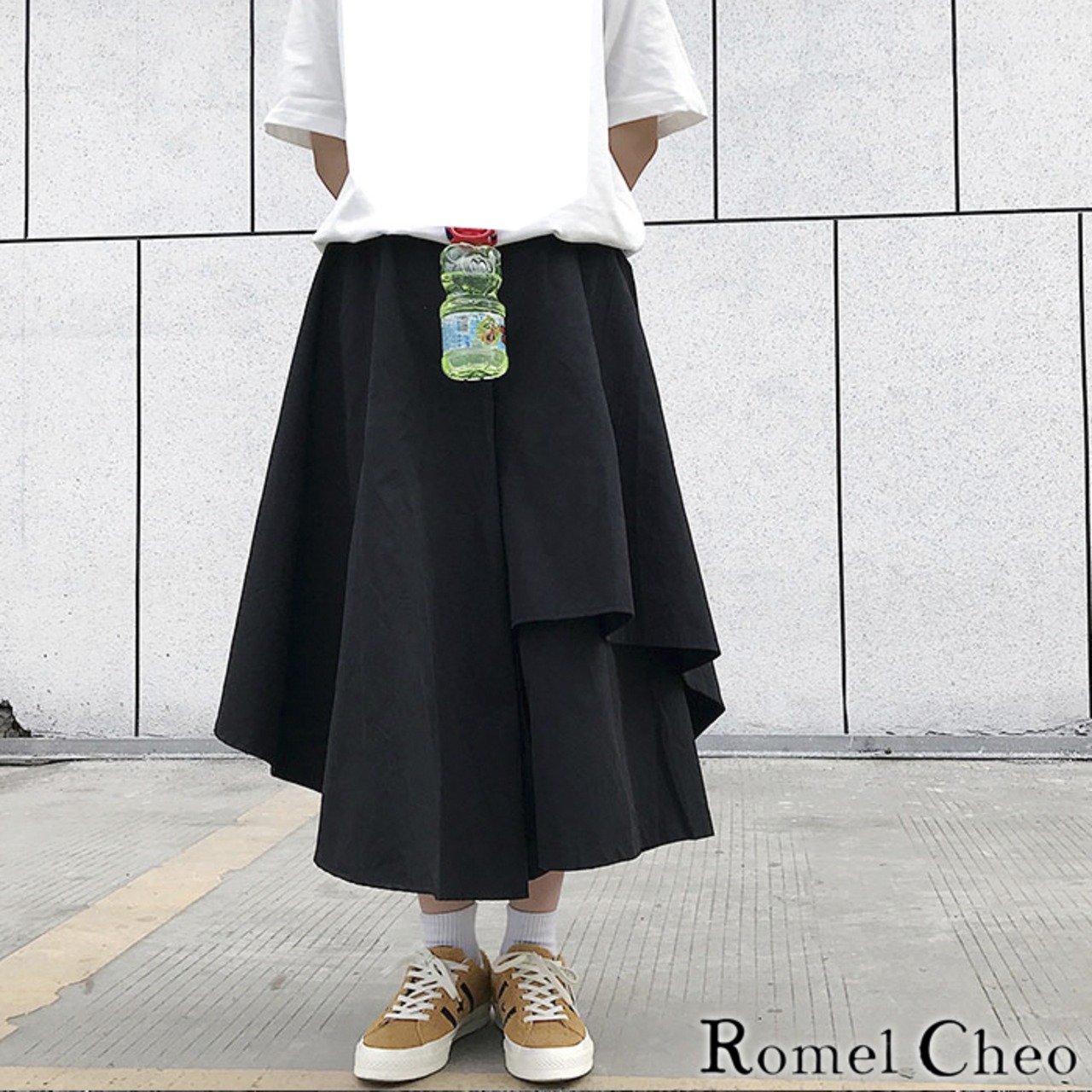 RomelCheo アシンメトリー ロング スカート ミモレ丈 ドレープ aライン レディース アシメ モード系 ロック v系 ストリート ファッション 韓国 オルチャン サロン系 ラップ 巻き パンツ レイヤード 大人可愛い スカーチョ ガウチョ 森ガール ロメルチェオ