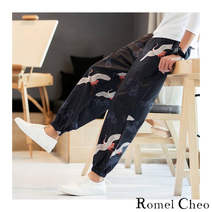 RomelCheo イージー パンツ ジョガー 和柄 和風 モダン 鶴柄 波模様 花柄 9分丈 メンズ レディース ユニセックス アジアン エスニック ファッション ストリート カジュアル 原宿系 総柄 綿 ゆったり ウエストゴム 春 夏 服 ロメルチェオ