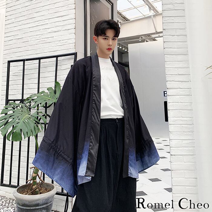 RomelCheo 羽織 和服 モダン 着物 和風 和柄 グラデーション 濃淡 星空 2way袖 フレアスリーブ ロング カーディガン 袴 モード ストリート コーディガン メンズ コート 上着 和装 ロメルチェオ