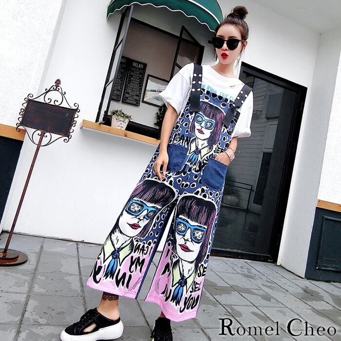 RomelCheo オーバーオール サロペット オールインワン デニム パンツ ジーンズ ワイド ガウチョ レディース 原宿系 個性的 派手 落書き イラスト プリント つなぎ ストリート カジュアル アメカジ 古着風 ブルー ロメルチェオ