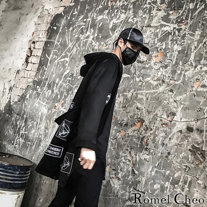 RomelCheo ストリート パーカー カーディガン コーディガン フード付き ミドル丈 メンズ レディース ユニセックス コート ローブ ガウン マント 黒 原宿系 モード系 ファッション カジュアル ベルト おしゃれ カッコいい ロメルチェオ