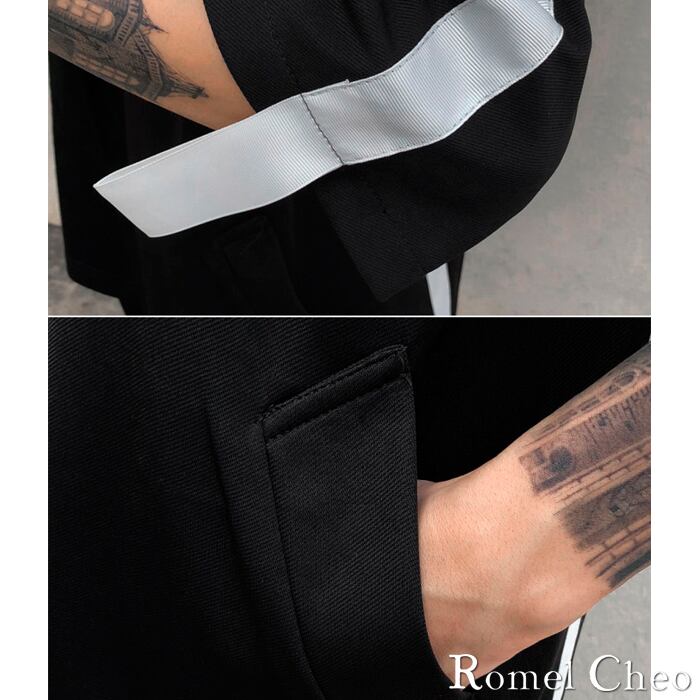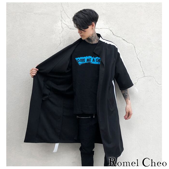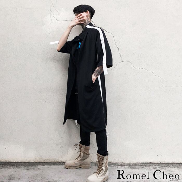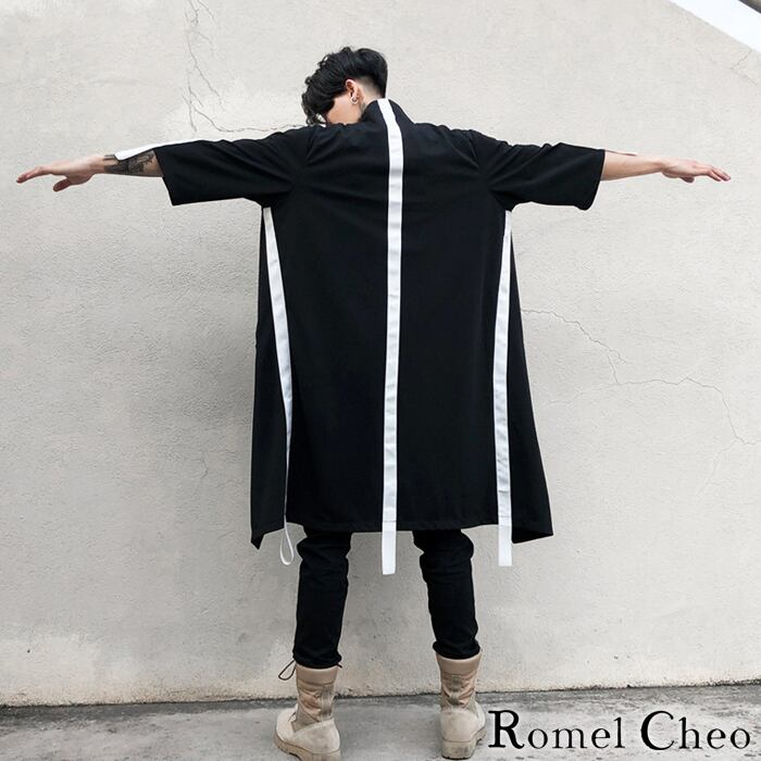 RomelCheo モノクロ ライン カーディガン コート コーディガン 5分袖 半袖 メンズ 黒 ストリート カジュアル モード系 v系 春 夏 秋 服 バイカラー スタンドカラー ロング アウター おしゃれ カッコいい モダン 和風 ロメルチェオ