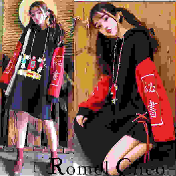 RomelCheo 和風 パーカー ビッグシルエット 原宿系 プルオーバー チュニック レースアップ ゆったり 和服 和柄 刺繍 オーバーサイズ ビッグパーカー ワンピース ロメルチェオ