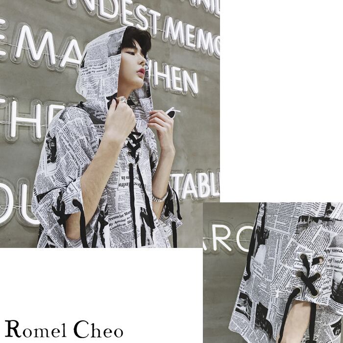 RomelCheo 新聞 ニュースペーパー プリント パーカー オーバーサイズ 半袖 メンズ フーディー tシャツ プルオーバー 原宿系 ストリート ヒップホップ hiphop カジュアル レースアップ トップス 夏 服 総柄 ロメルチェオ