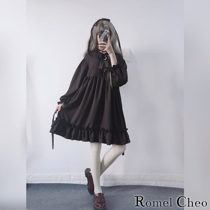RomelCheo ゴシック ロリータ ゴスロリ ワンピース フリル リボン ミニ ドレス ワンピ ブラック 黒ゴス aライン 膝上丈 長袖 服 レディース ティーンズ 原宿系 病みかわ ゆめかわ ガーリー 大人可愛い ロメルチェオ