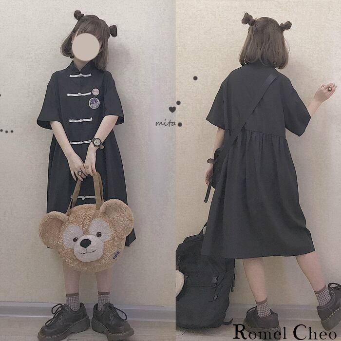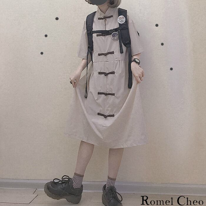 RomelCheo チャイナボタン ワンピース ひざ下丈 ミディアム丈 原宿系 ファッション ブラック ミディ丈 ベージュ レディース 大人可愛い ゆめかわ 病みかわ 青文字系 メルヘン ロリータ シャツワンピ 半袖 ロメルチェオ