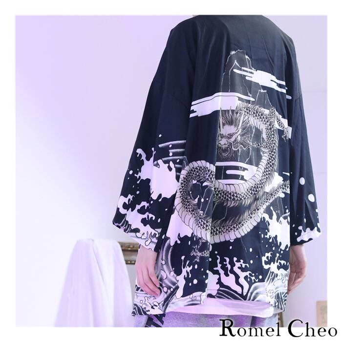 RomelCheo 龍柄 羽織 和服 和柄 和風 モダン 現代風 七分袖 7分袖 上着 法被 メンズ レディース ユニセックス アジアン エスニック ファッション ストリート系 b系 オラオラ系 カジュアル 原宿系 カーディガン トップス ロメルチェオ