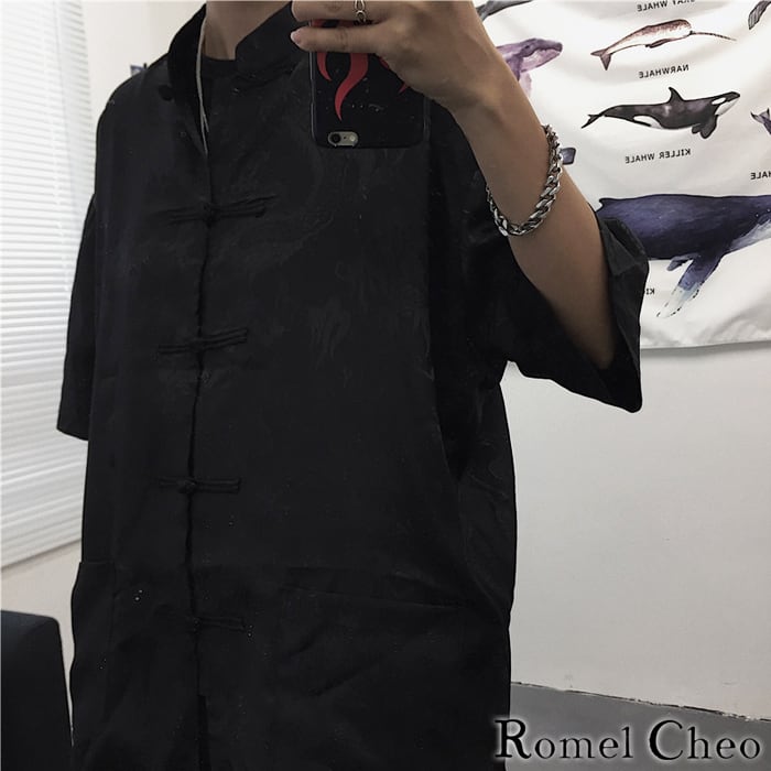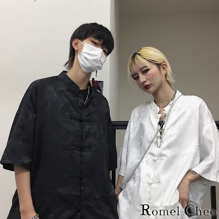 RomelCheo 龍柄 チャイナシャツ モノクロ チャイナ服 メンズ レディース ユニセックス チャイナボタン シャツ マオカラー 半袖 和柄 チャイナ風 韓国 ストリート系 原宿系 b系 モード系 v系 アジアン エスニック 黒 白 モード系 モノトーン ロメルチェオ