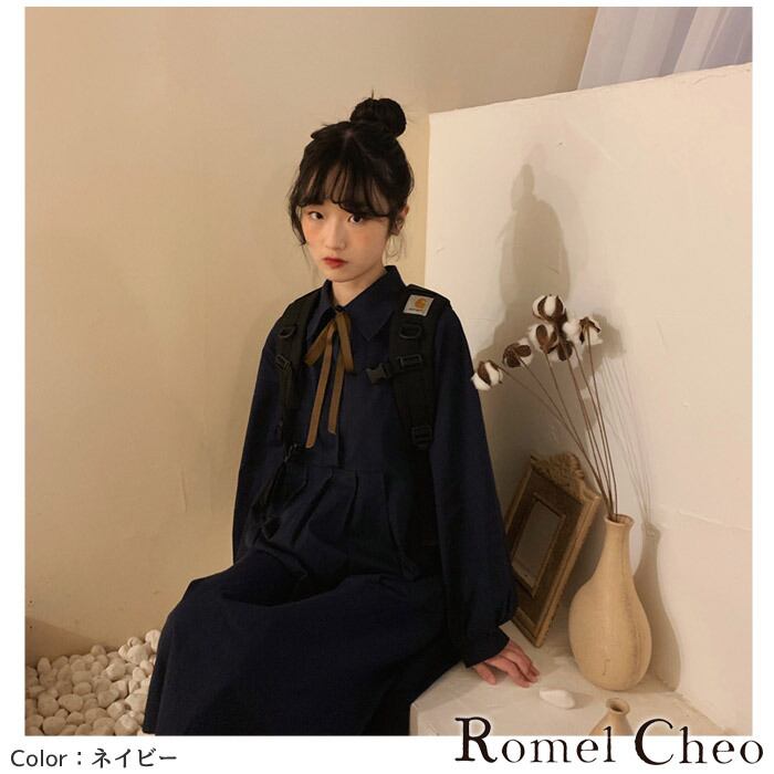 RomelCheo 首リボンワンピース ワンピ ひざ下丈 Aライン ロリータ レディース 原宿系 カジュアル フェミニン ガーリー ゆるかわ おしゃれ かわいい 長袖 無地 ロメルチェオ
