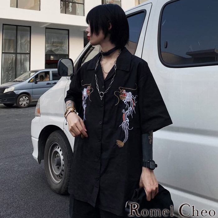 RomelCheo 龍柄刺繍シャツ ユニセックス チャイナ風 和風 和柄 ロング丈 ポロシャツ 和服 半袖 オーバーサイズ ファッション 韓国 ストリート ロンT 原宿系 かわいい 病みかわ オルチャン モード系 ロメルチェオ
