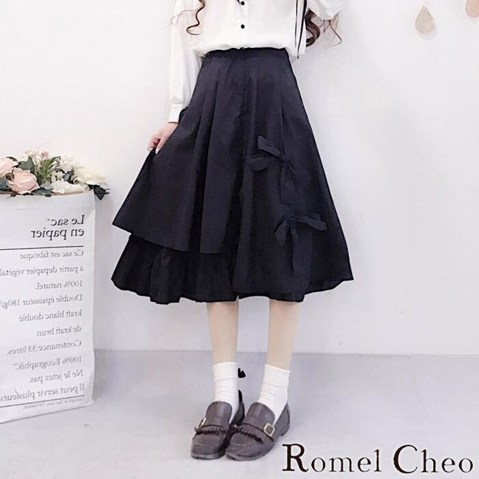 RomelCheo 黒リボンアシメスカート リボンスカート 黒 モノトーン レディース ロリータ ゴス ドレープ ゆるかわ ガーリー ひざ丈 アシンメトリー 美ライン フレア モード系 ファッション 服 カジュアル きれいめ おしゃれ ロメルチェオ