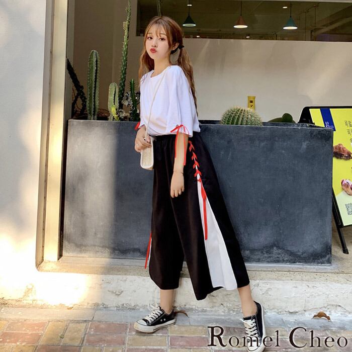 RomelCheo 編み込みガウチョパンツ ワイドパンツ Aライン レディース 夢かわいい 美シルエット 袴パンツ ウエストゴム 切替え ガウチョ 七分丈 原宿系 青文字系 オルチャン おしゃれ 病みかわ ロメルチェオ