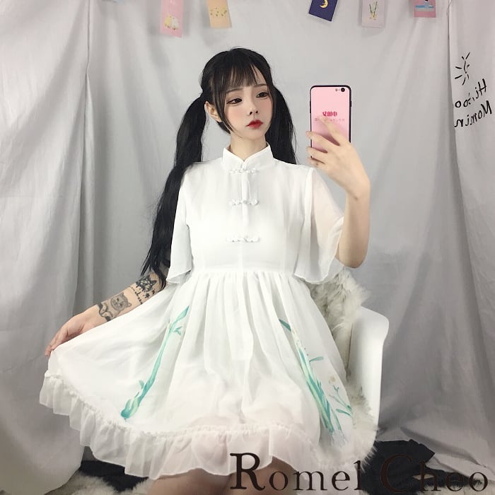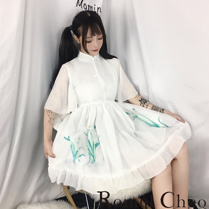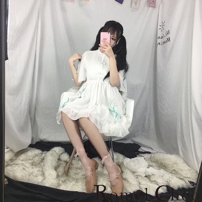 RomelCheo チャイナシースルーワンピ モノクロ チャイナ服 レディース 花柄刺繍 原宿系 かわいい ロリータ 青文字系 アジアン ガーリー フレアーワンピ エスニック フラワープリント 黒 白 モード系 モノトーン ロメルチェオ