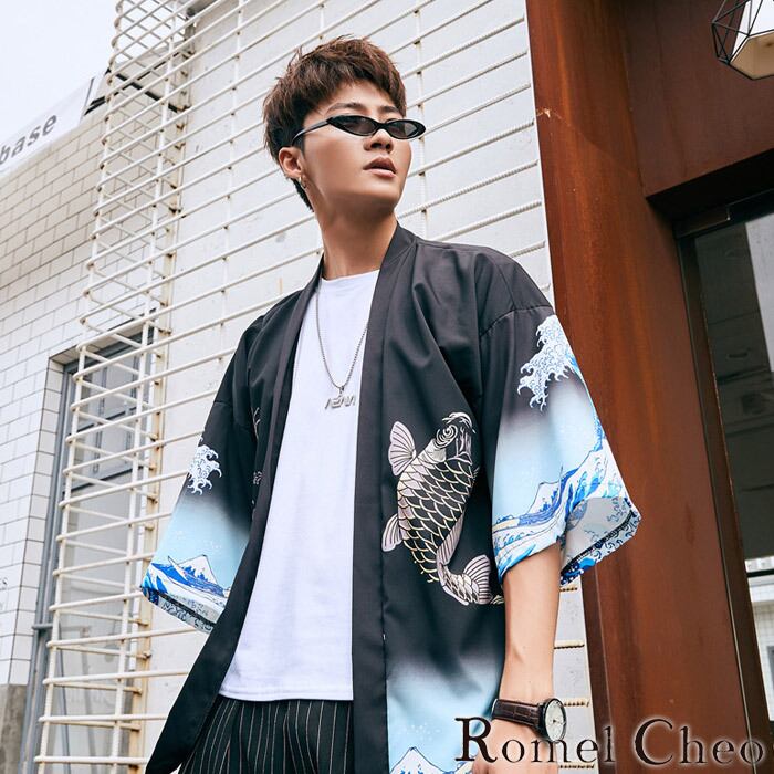 RomelCheo 鯉柄羽織り 和柄 和風 シャツ 五分袖 総柄 波 和式パーカー コーディガン ジャケット 秋 モード系 和装 メンズ 浴衣 レディース ユニセックス 原宿系 ストリート ロメルチェオ