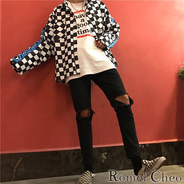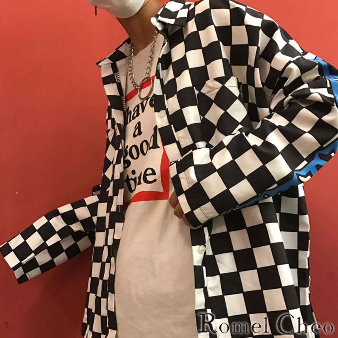 RomelCheo ファイヤーチェッカーフラッグシャツ マウンテンパーカー ブロックチェック 長袖 オーバーサイズ ジャケット ライト アウター ストリート パンク ロック HIPHOP ダンス アメカジ 市松柄 原宿系 ロメルチェオ 【nations1_d19】