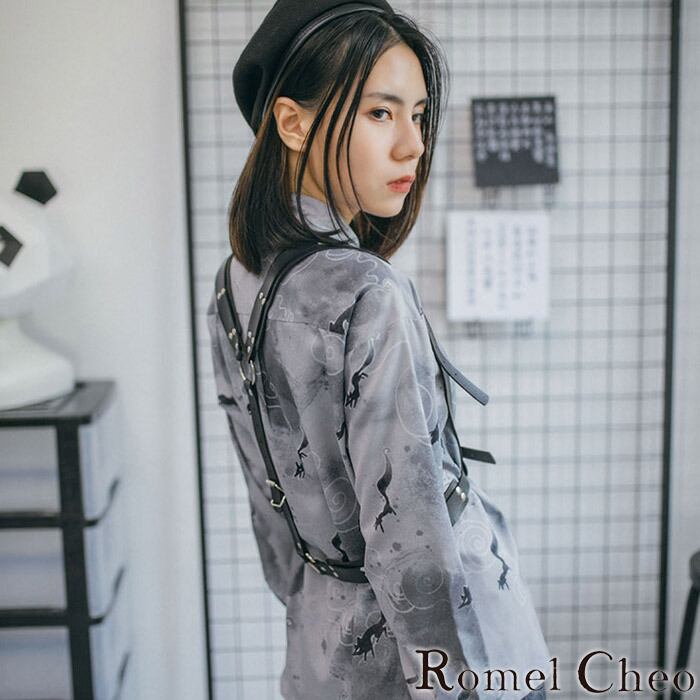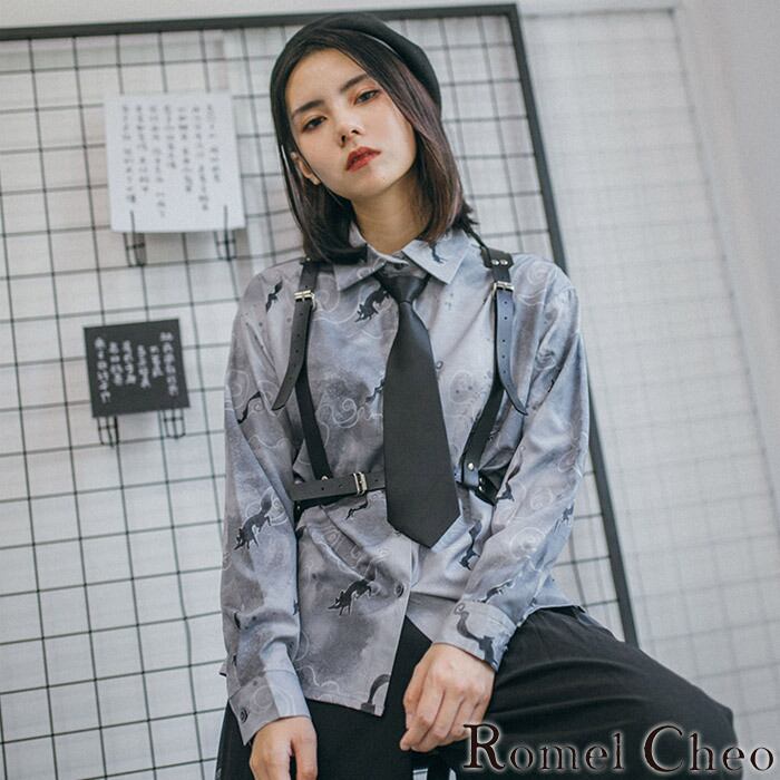 RomelCheo ベルト付き和柄シャツ カジュアル 長袖 ブラウス 和風 和柄 アジアン エスニック モダン モード ストリート ロック きれいめ 原宿系 青文字系 レディース ファッション ロメルチェオ