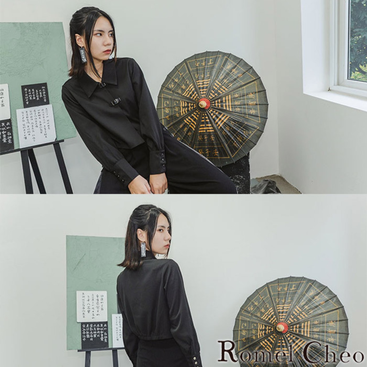 RomelCheo ショート丈黒シャツ カジュアル 長袖 ブラウス ロングカフス デザインスリーブ 無地 ベルト モダン モード ストリート ロック パンク きれいめ 原宿系 青文字系 レディース ファッション ロメルチェオ