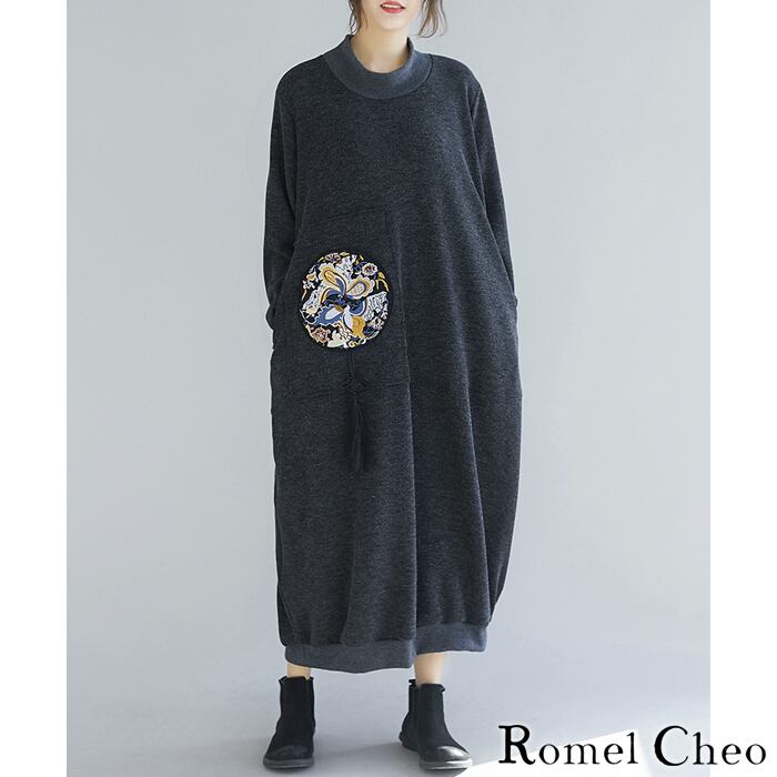 【お支払い確認後20日以内発送】 RomelCheo 花柄 刺繍 ニット マキシワンピース マキシ丈 ロング ワンピース オーバーサイズ ビッグシルエット レディース 秋冬 長袖 ゆったり ハイネック モックネック コクーン 韓国 ファッション エスニック ロメルチェオ