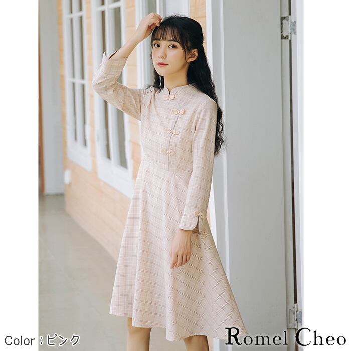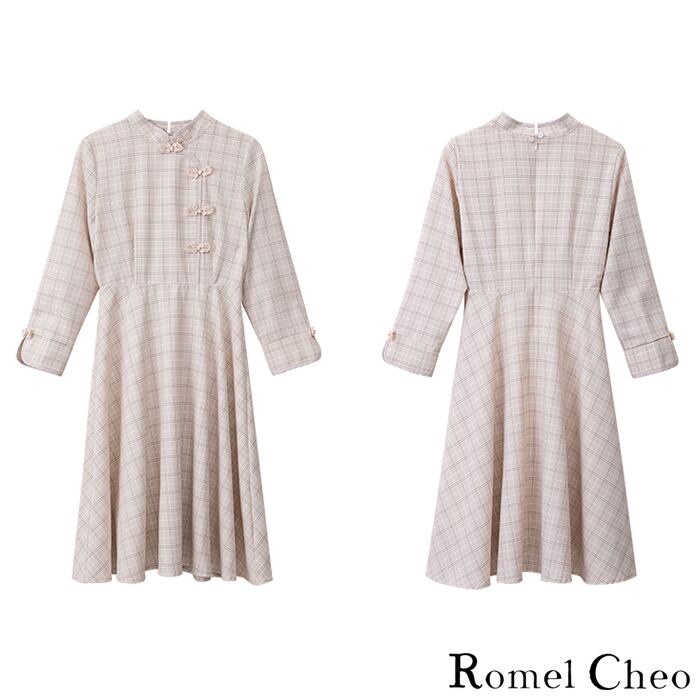 RomelCheo チェック チャイナ風 ワンピース チャイナボタン 膝丈 レディース 九分袖 カジュアル フレア チャイナ服 チャイナ ドレス 漢服 原宿系 ゆめかわ 病みかわ 青文字系 ファッション ロメルチェオ