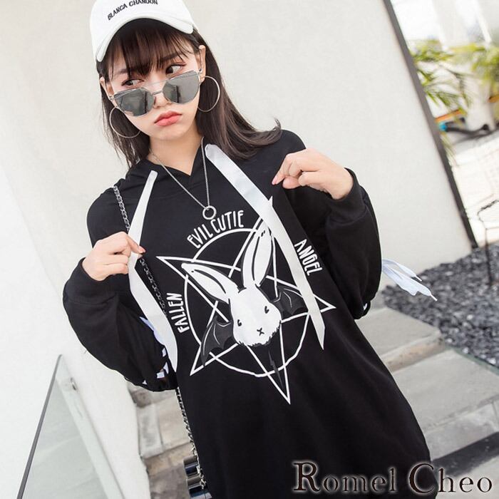 RomelCheo ウサギ魔法陣ワンピース パーカー リボン 長袖 ビックシルエット オーバーサイズ ロリパン ゴスパン パンク ロック ストリート プルオーバー バンド 青文字系 原宿系 夢かわ 病みかわ V系 ファッション カジュアル ロメルチェオ