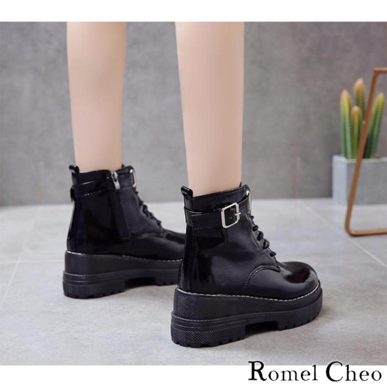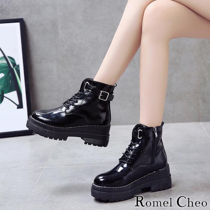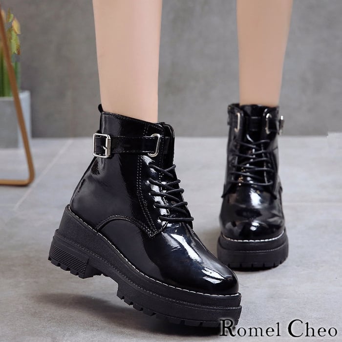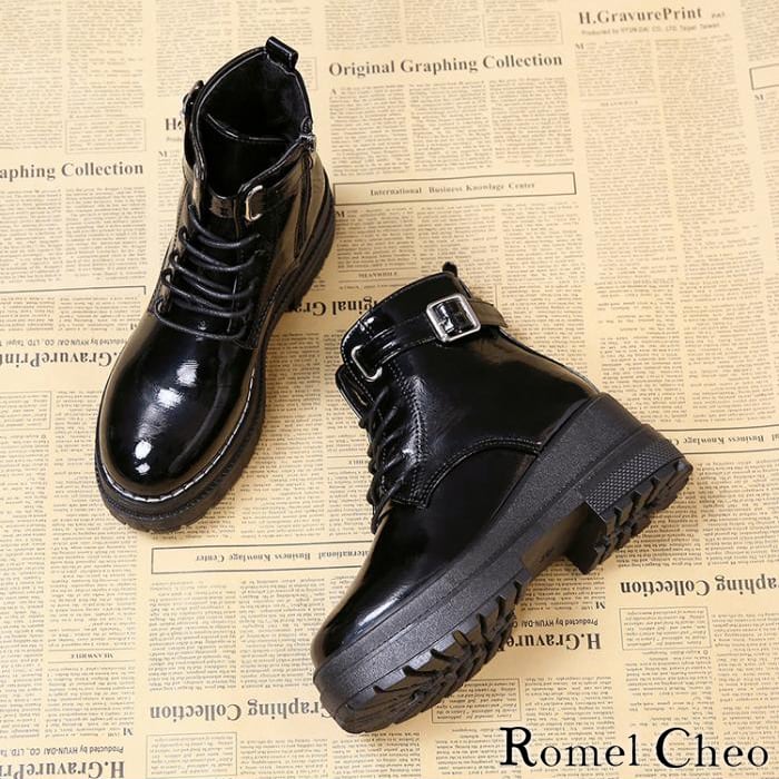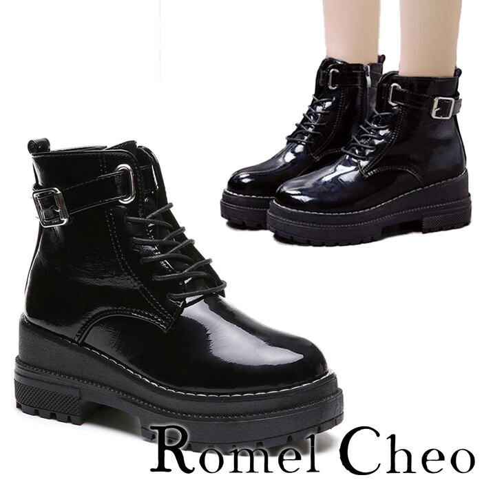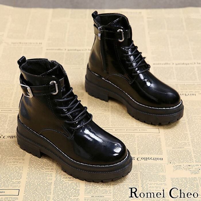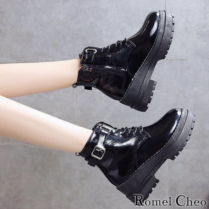 RomelCheo ショート ジョッパー ブーツ 厚底 黒 エナメル シューズ 靴 レディース 合成皮革 フェイクレザー 滑りにくい 耐水性 耐久性 韓国 モード系 ストリート系 カジュアル サイドファスナー 紐靴 レースアップ ロメルチェオ