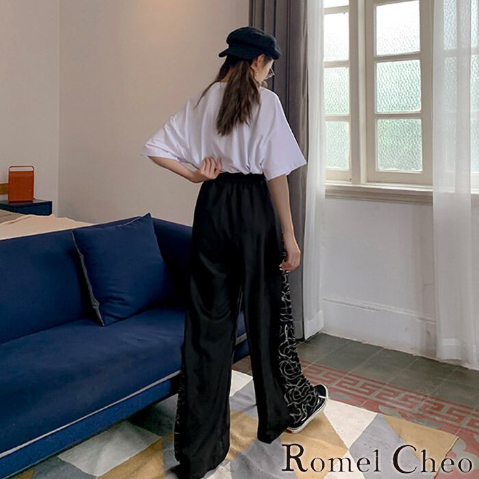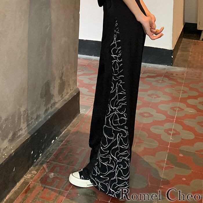 【お支払い確認後20日以内発送】 RomelCheo 切り替え総柄ワイドパンツ ガウチョパンツ 袴パンツ ゆったり はかまパンツ スカンツ ワイドパンツ タイパンツ ストリート 切替え モード 原宿系 青文字系 カジュアル ファッション ロメルチェオ