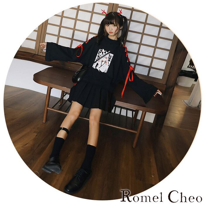 RomelCheo 和柄黒スカート モントーン ミニスカート 和柄 和テイスト アジアン エスニック レトロ モダン ロリータ ゆめかわいい 和風 原宿系 青文字系 ストリート系 韓国 レディース ファッション カジュアル ロメルチェオ