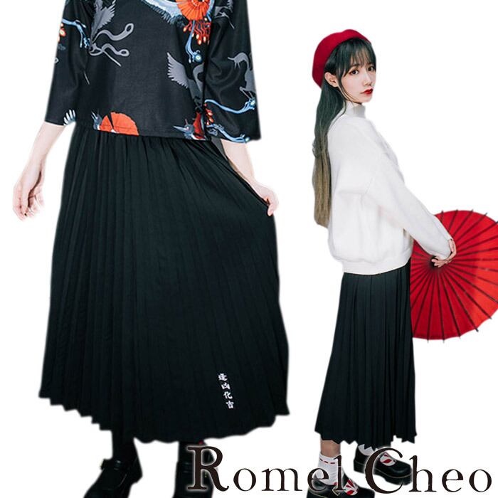RomelCheo 文字入りシンプル黒スカート ギャザースカート タックスカート モントーン ロングスカート 和テイスト 和風 アジアン エスニック モダン 原宿系 青文字系 韓国 レディース ファッション カジュアル ロメルチェオ
