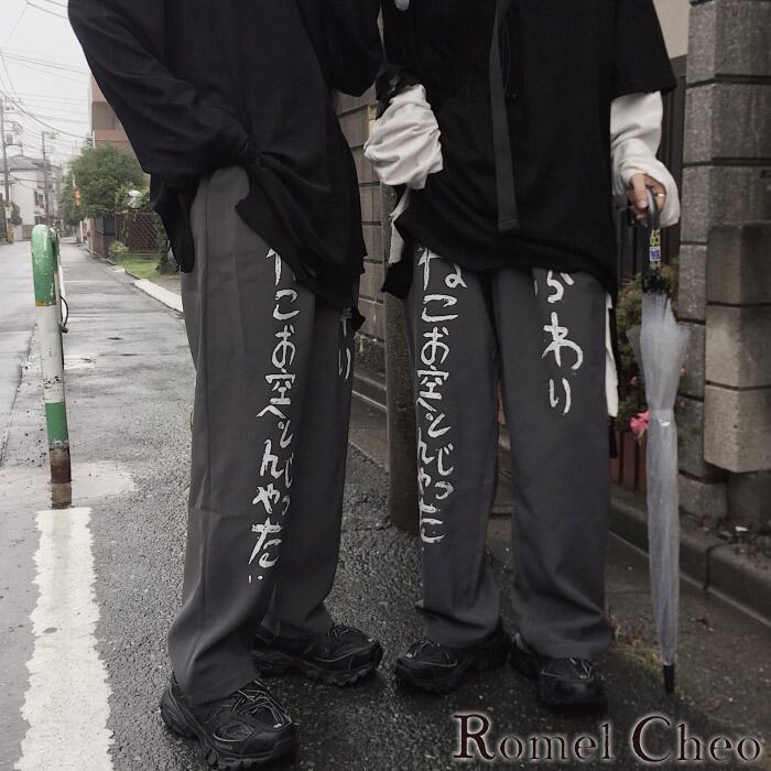 RomelCheo 文字入りワイドパンツ 太め ボリューム ルーズシルエット リラックス バギーパンツ ゆったり メンズ 個性的 奇抜 韓国 ヒップホップ ファッション 原宿系 カジュアル ロメルチェオ
